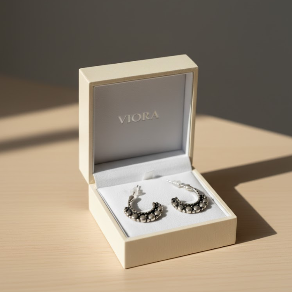 These rustic half-hoop earrings feature an antique silver finish and a unique granulated dotted texture, embodying effortless bohemian style. A perfect everyday staple with vintage charm.