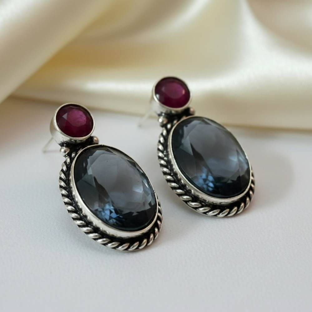 Dive into a world of enchanting contrast with the Viora Crimson Ocean Drops. These captivating earrings feature a bold, deep crimson (ruby-red) stud, gracefully suspended above a large, mesmerizing oval gemstone in a smoky "ocean blue" or "grey-blue" hue. Encased in an intricately braided silver-tone frame, these bohemian-inspired drops exude an antique charm with a modern twist. Perfect for adding a unique pop of color and artisanal elegance to any outfit, the Crimson Ocean Drops are designed to make a distinctive statement.