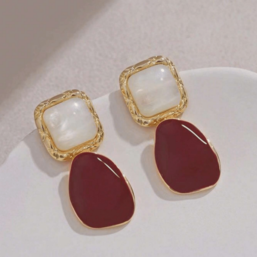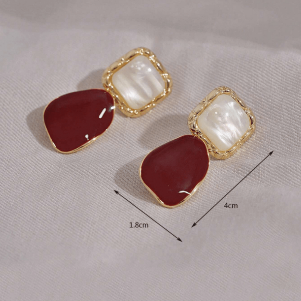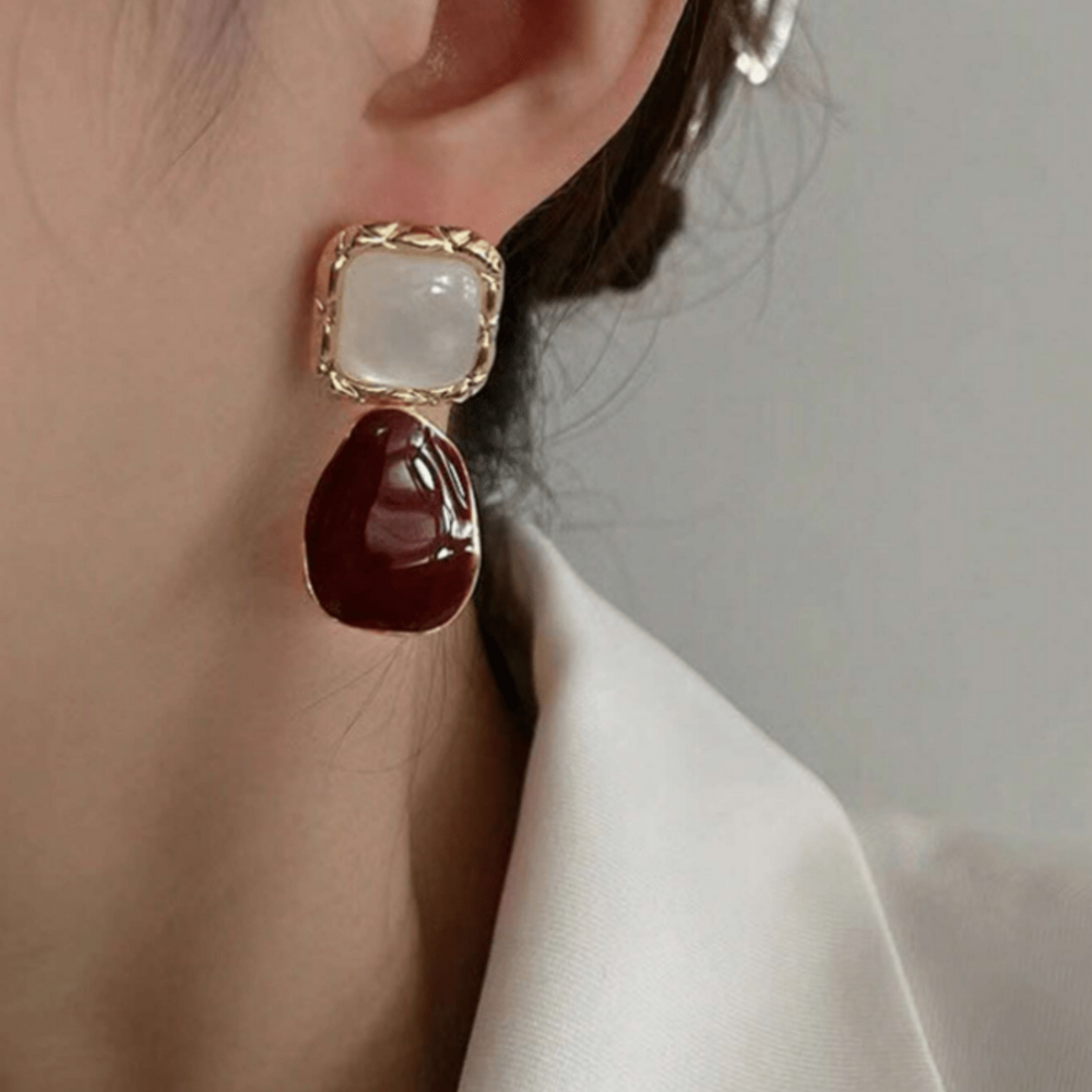 Chic two-tone drop earrings featuring a square ivory stud with antique silver and gold detailing, suspending a glossy, deep burgundy enamel or resin drop.