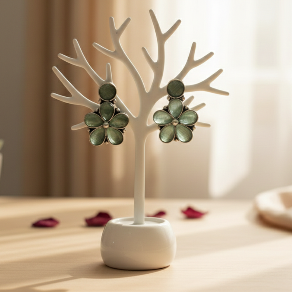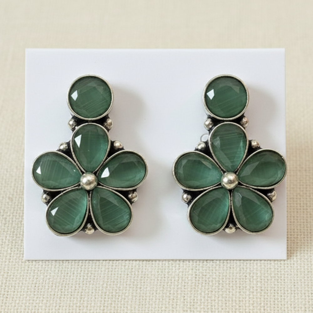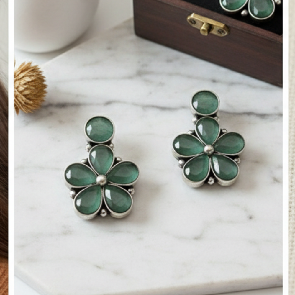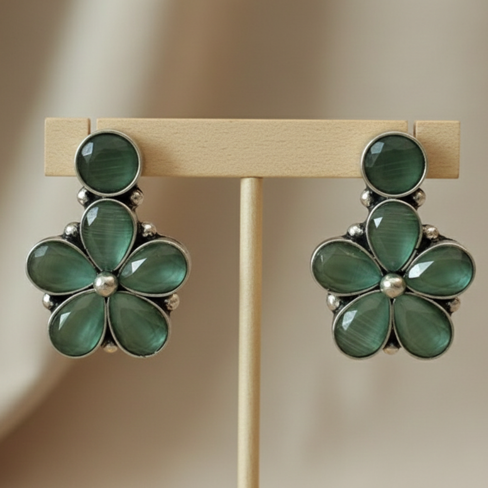 Breathe life into your ensemble with these enchanting floral studs. Featuring sea-green stones with a unique cat-eye sheen, these petals are set in a vintage silver-toned frame to capture the serene beauty of a misty woodland.