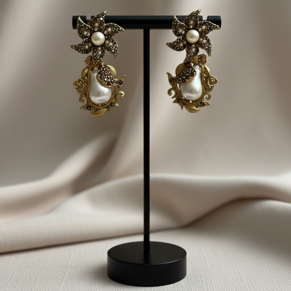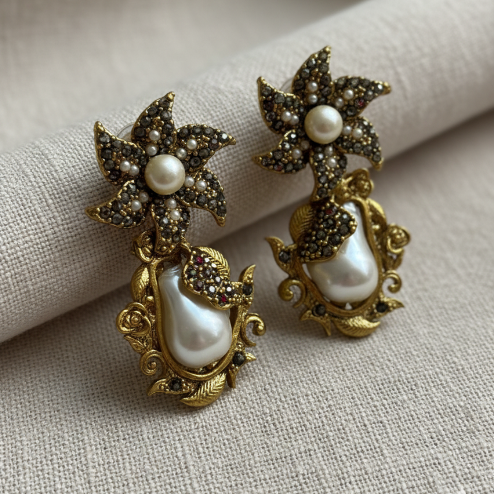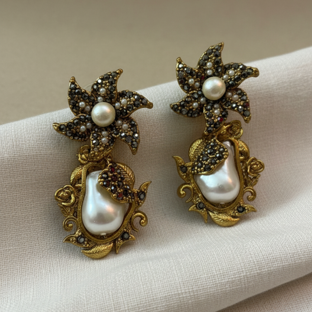 Unleash your inner glow with the exquisite Viora Golden Gleam Earrings. These captivating earrings feature a starburst floral motif adorned with sparkling dark crystals and a central luminous pearl, descending into a baroque-inspired golden frame embracing a lustrous, unique-shaped pearl. With hints of delicate ruby-red stones, these earrings perfectly blend vintage charm with opulent elegance, ensuring you shine brightly at any occasion.