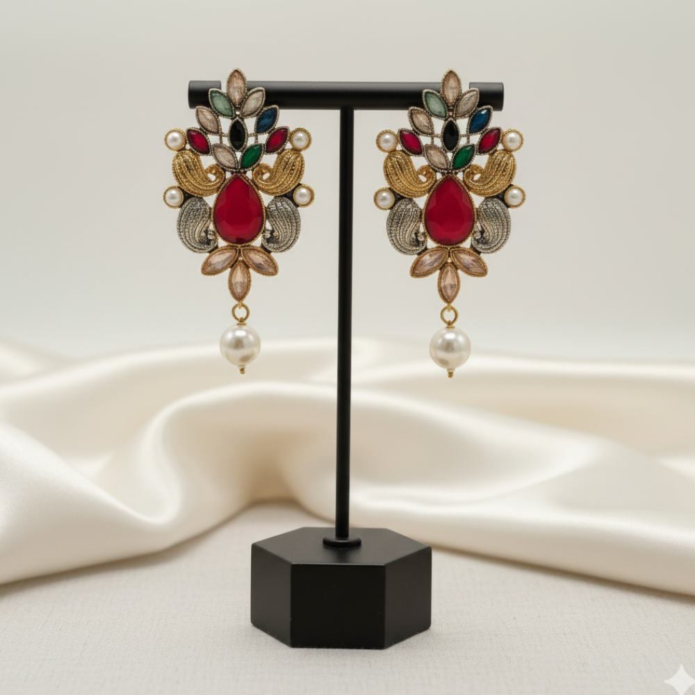 Elevate your elegance with Viora’s Gulnaar Grace Earrings — inspired by blooming pomegranate flowers. Featuring a radiant ruby-red stone surrounded by colorful gems, antique gold-silver detailing, and pearls, these earrings bring timeless beauty and regal charm to any occasion.