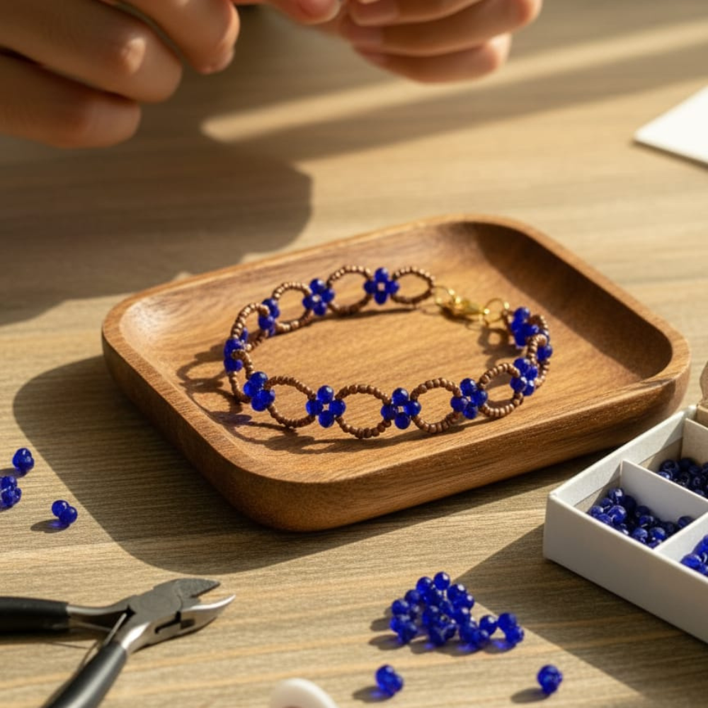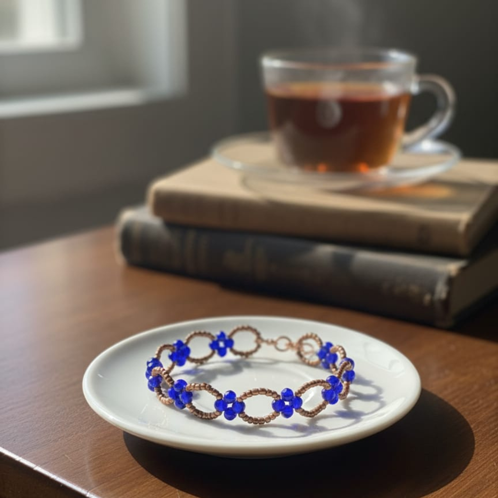 This exquisite bracelet is handcrafted using brilliant Cobalt Blue crystals woven into repeating four-petal floral shapes, connected by warm, contrasting Bronze toned links. The striking color combination and intricate beading create a look that is both delicate and dazzling. It's the perfect statement piece to elevate your look with a touch of handcrafted luxury.
