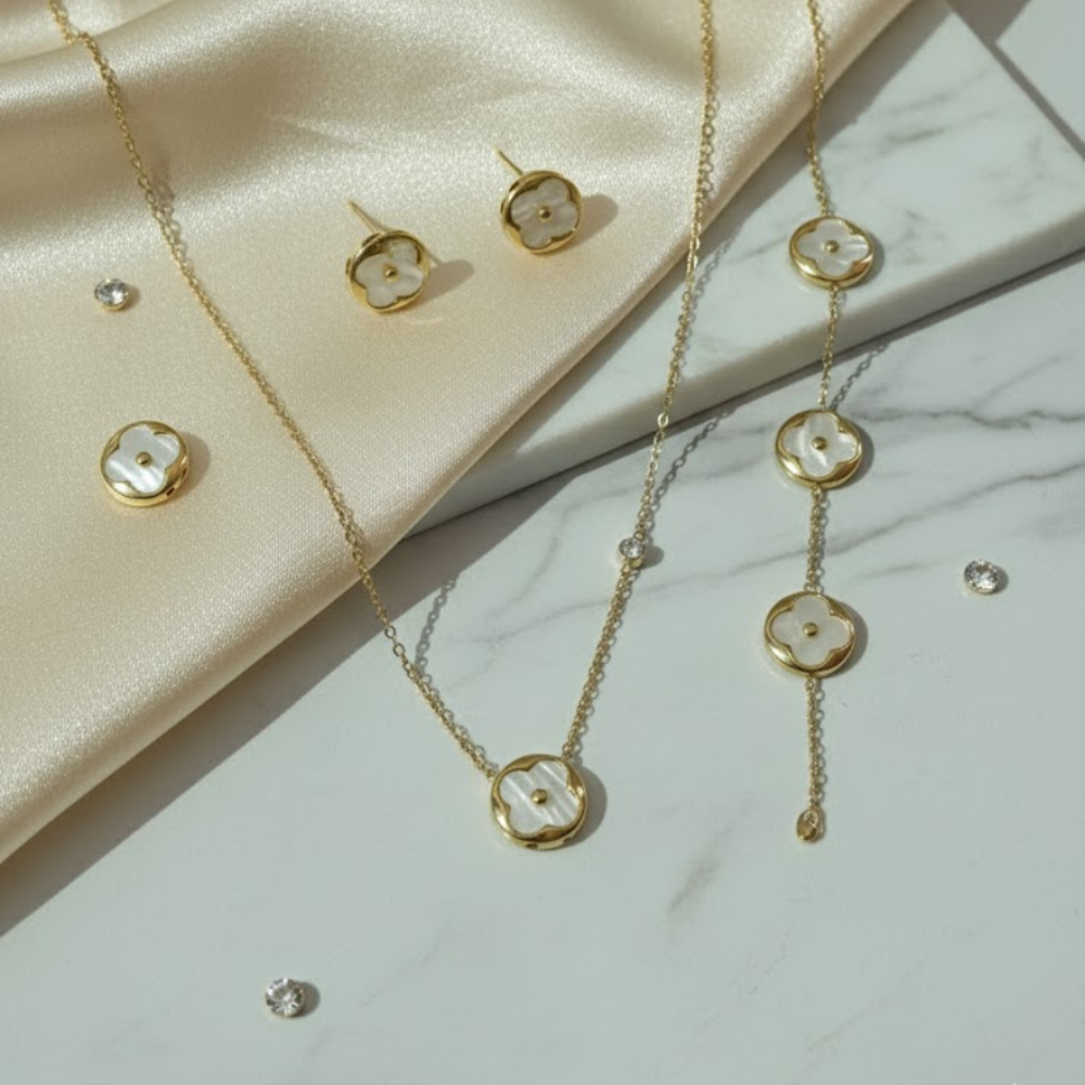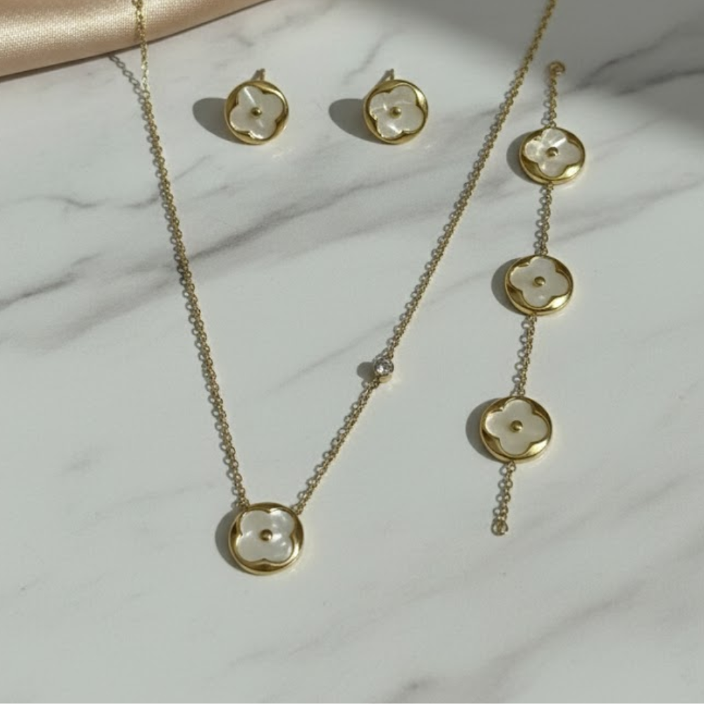 Embrace timeless elegance with the Ocean Aura Set — a beautifully coordinated trio featuring a floral-inspired bracelet, matching earrings, and a graceful chain. Designed in white enamel and gold tones, this set adds a fresh, radiant glow to any outfit — perfect for both casual charm and refined occasions.