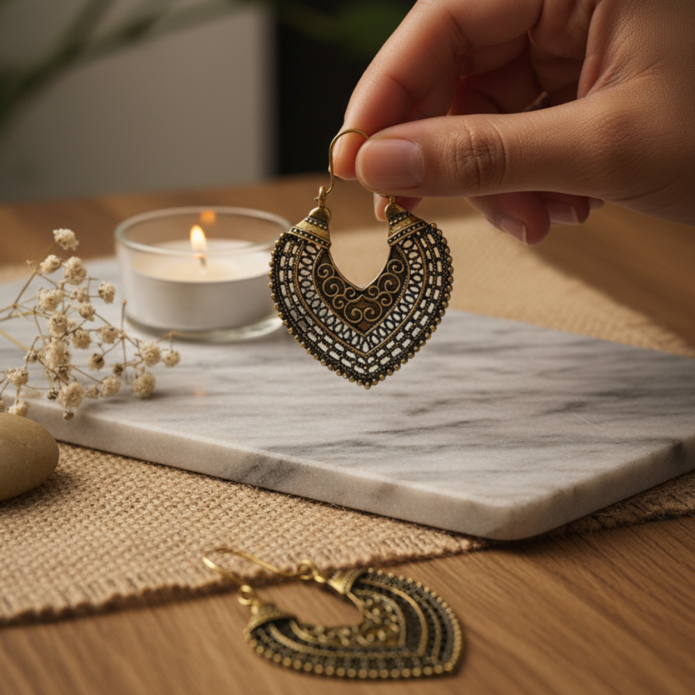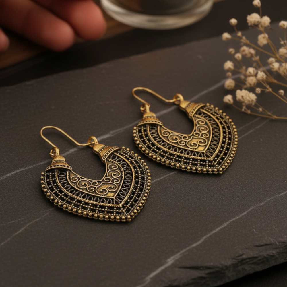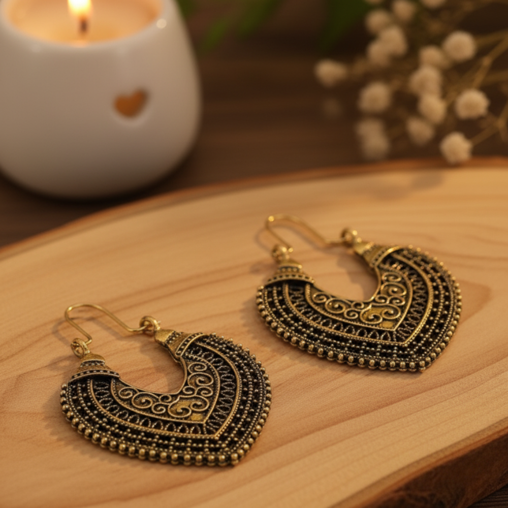 Elevate your look with the timeless charm of Radiant Hollow Earrings. Designed with intricate hollow patterns and finished in antique gold, these earrings are the perfect mix of bold elegance and vintage artistry. Lightweight yet eye-catching, they’re ideal for festive occasions, weddings, parties, or adding a boho-chic touch to your everyday style.