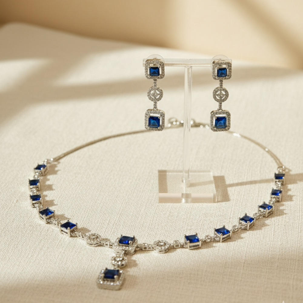 • Coordinating Drop Earrings: Features two square blue stones with crystal accents, perfectly complementing the necklace.
