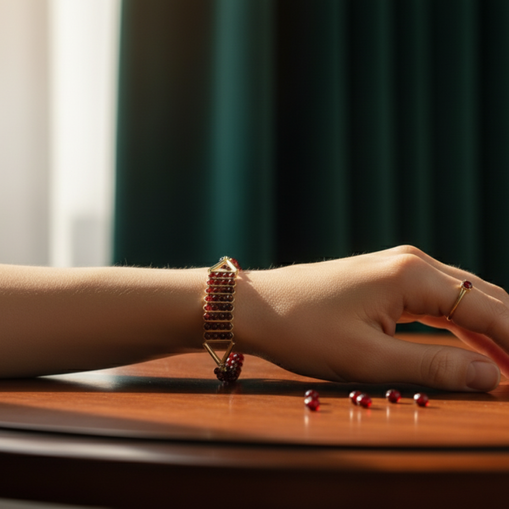 This handcrafted bracelet is a statement of understated luxury, featuring genuine, deep crimson garnet beads that evoke the rich color of a winter-blooming rose. The focal point is a striking geometric gold-toned centerpiece composed of five vertical rows of meticulously set garnet stones. Strung on a delicate, multi-strand wire, this bracelet is designed to drape gracefully on the wrist, adding a touch of regal passion and vintage elegance to any look. Perfect for gifting or for treating yourself to a timeless piece of artisan jewelry.